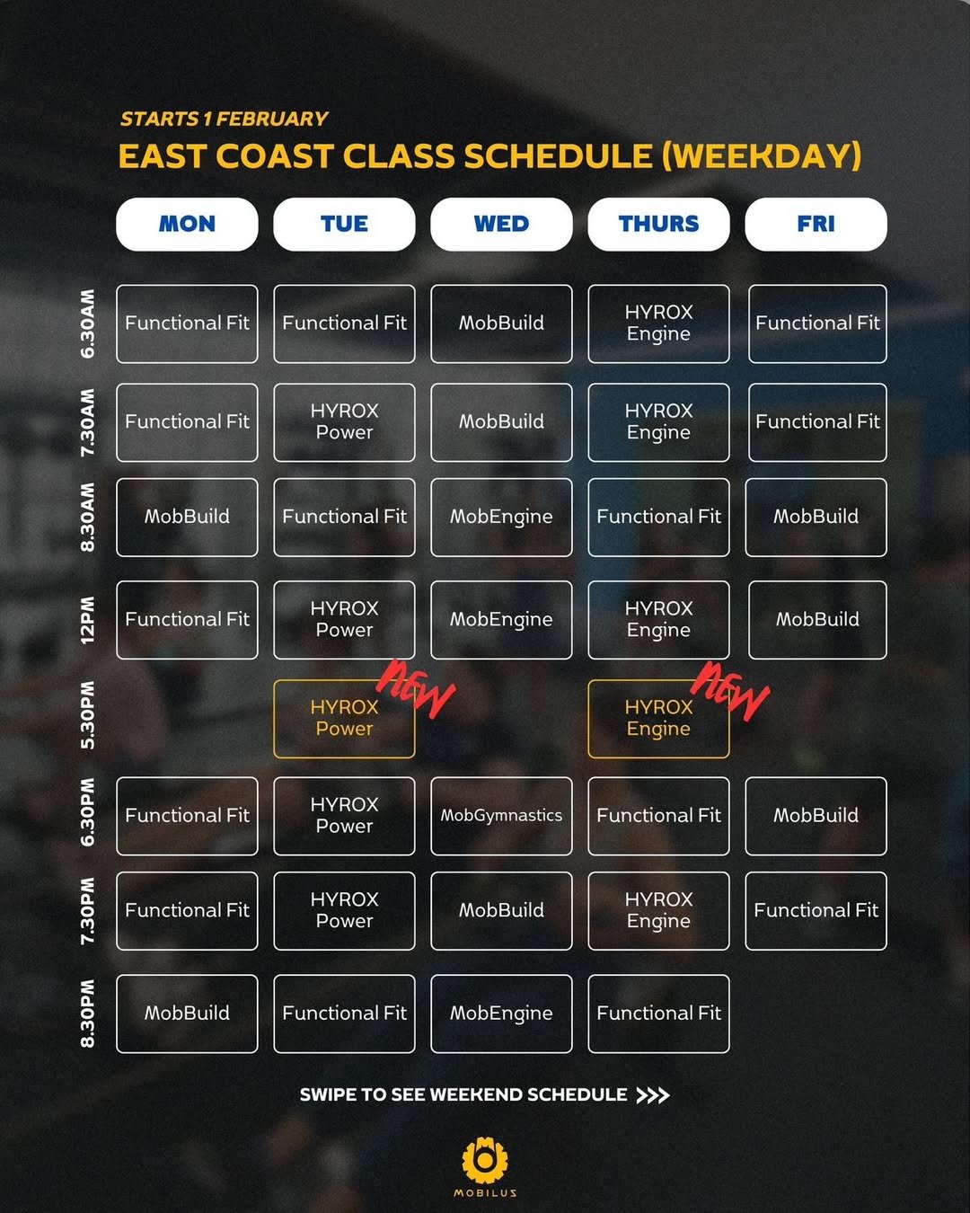 - MobEngine, MobBuild, MobGymnastics, MobStrong, Functional Fit, MobBasics, MobFit*, MobLift*, Open Gym